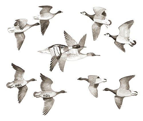 Plate 13 Various geese and Red-breasted Mergansers